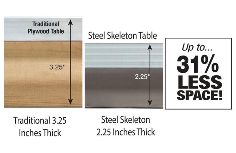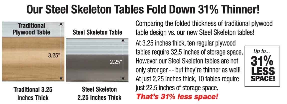 You'll never have to replace another runner with our steel skeleton tables. They also save you space, allowing you to store 13 tables in the space of 10.