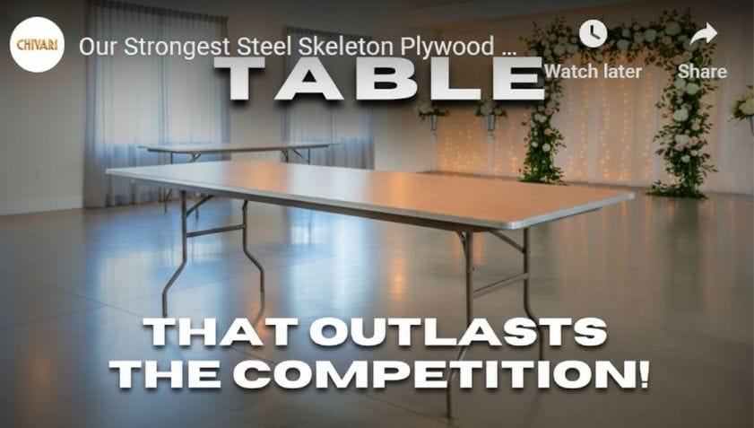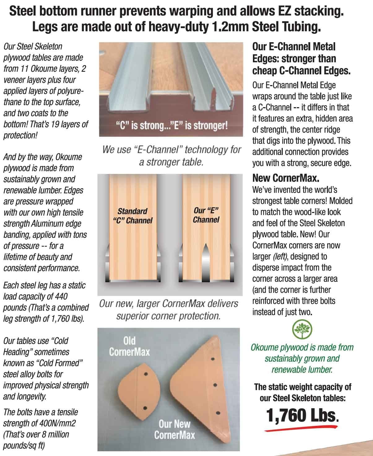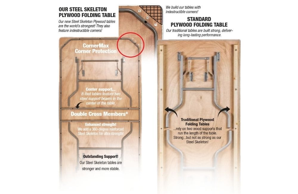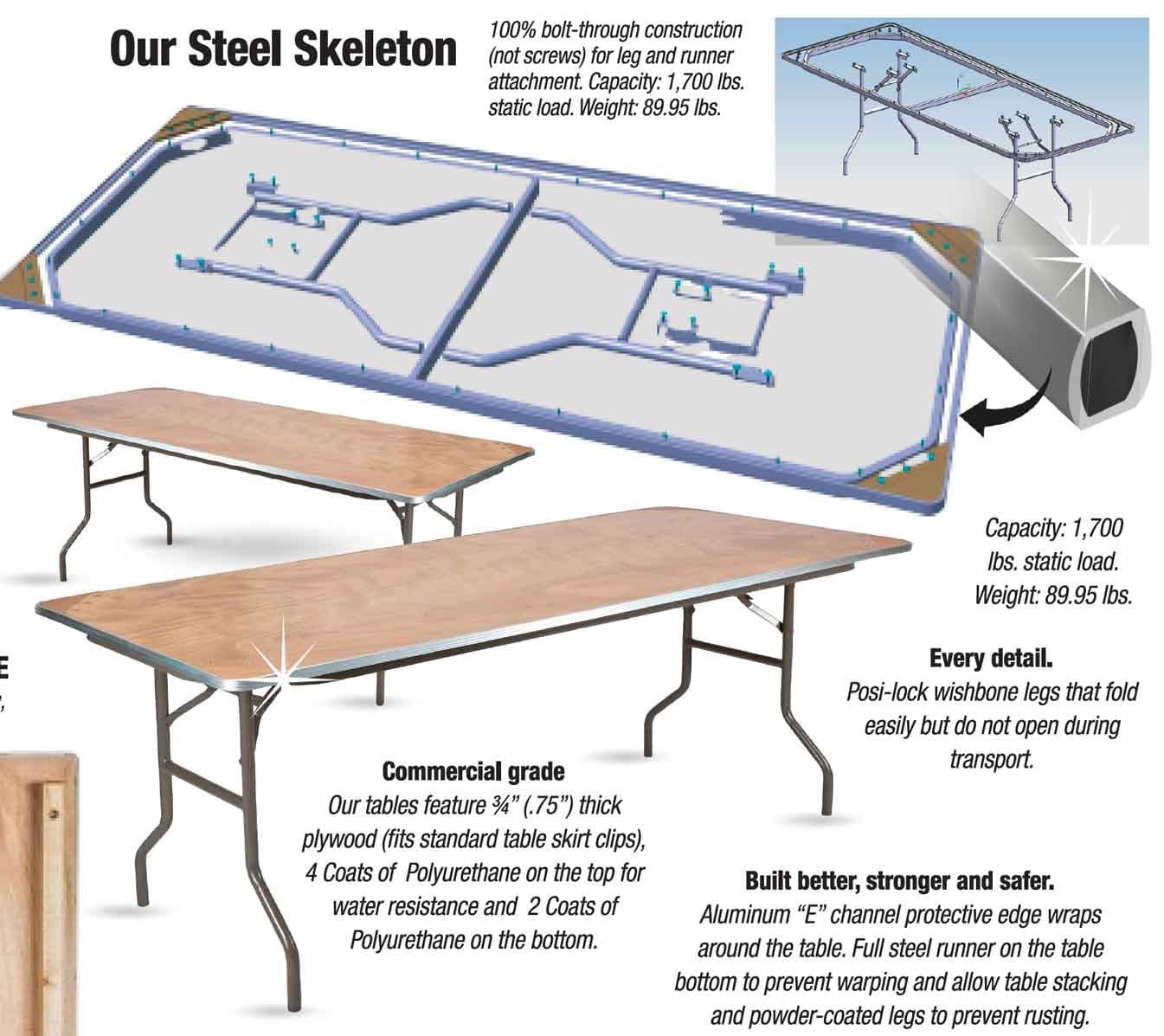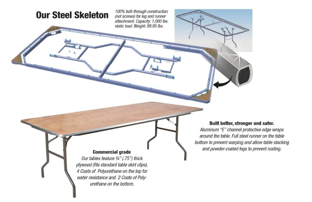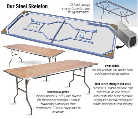 Our one-of-a-kind steel skeleton tables deliver unmatched strength for professional event setups. They're the top choice for weddings, banquets, and high-traffic venues where durability counts. Our steel skeleton folding tables are built stronger and last longer than normal folding tables.