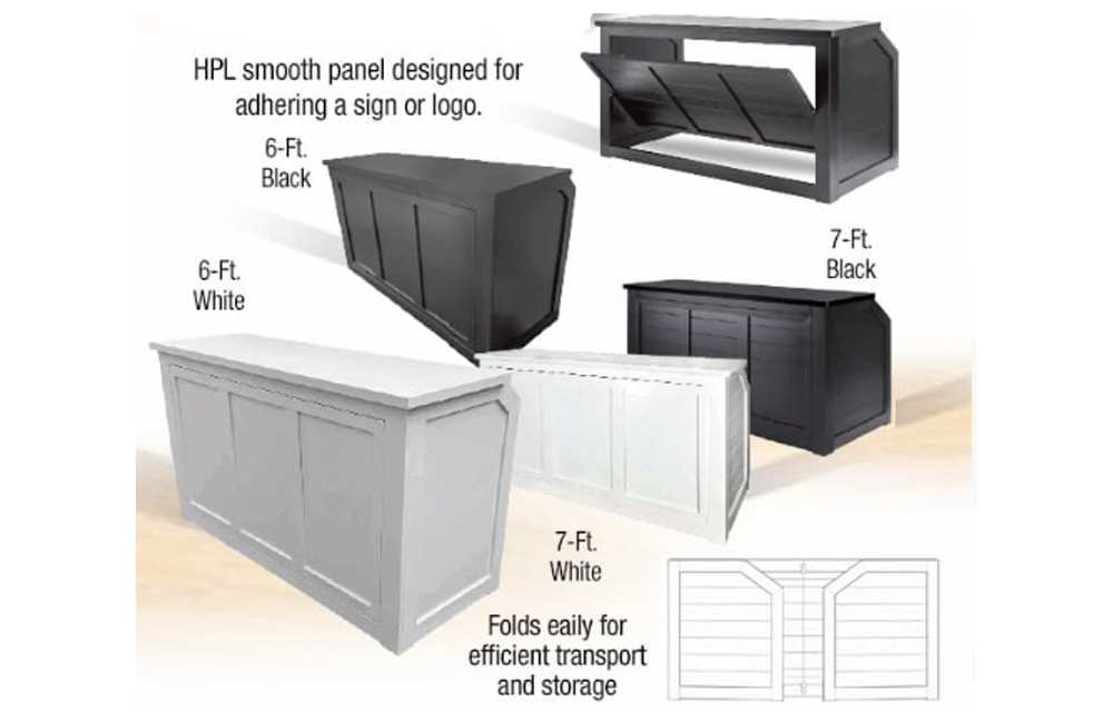 This 7' commercial folding bar is designed in the USA with a reversible front, HPL top, and raised panel construction to guard against spills. Built for transport and setup ease, it’s a go-to choice for weddings, banquets, and mobile event bars.