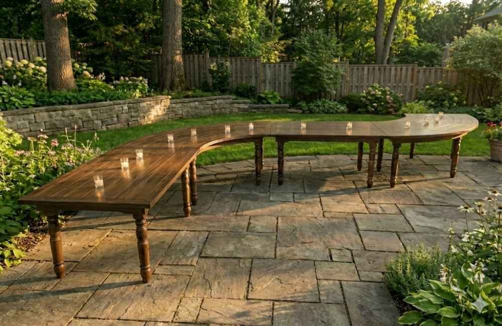Combine our Farm House Serpentine Tables with matching rectangular Farm House Tables for unique and distinctive layouts that are as flexible as your space allows.