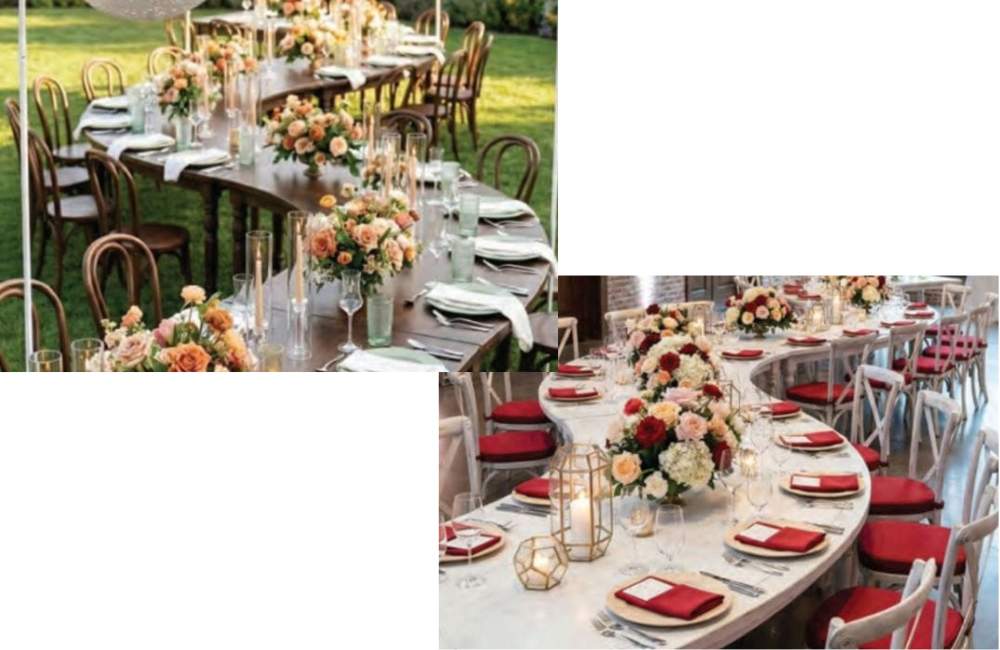 Create a captivating layout that is elegant and functional by combining a series of serpentine farm tables. The "S" curve configuration softens the room, guiding the eye gently across the space. The alternating curves create intimate pockets for conversation while maintaining the grandeur of a large banquet table.