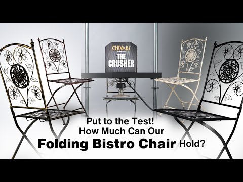 We are crushing every chair we sell. This allows us to show you how strong each chair really is. We applied over 800 pounds of downward force on our Barcelona Bistro Chair. As you’ll see in the video, all the joints held strong. However, the metal itself begins to bend when we surpassed 500 pounds of downward force. That’s why we give the Barcelona Bistro Chair a static weight capacity of 500 pounds. See for yourself: