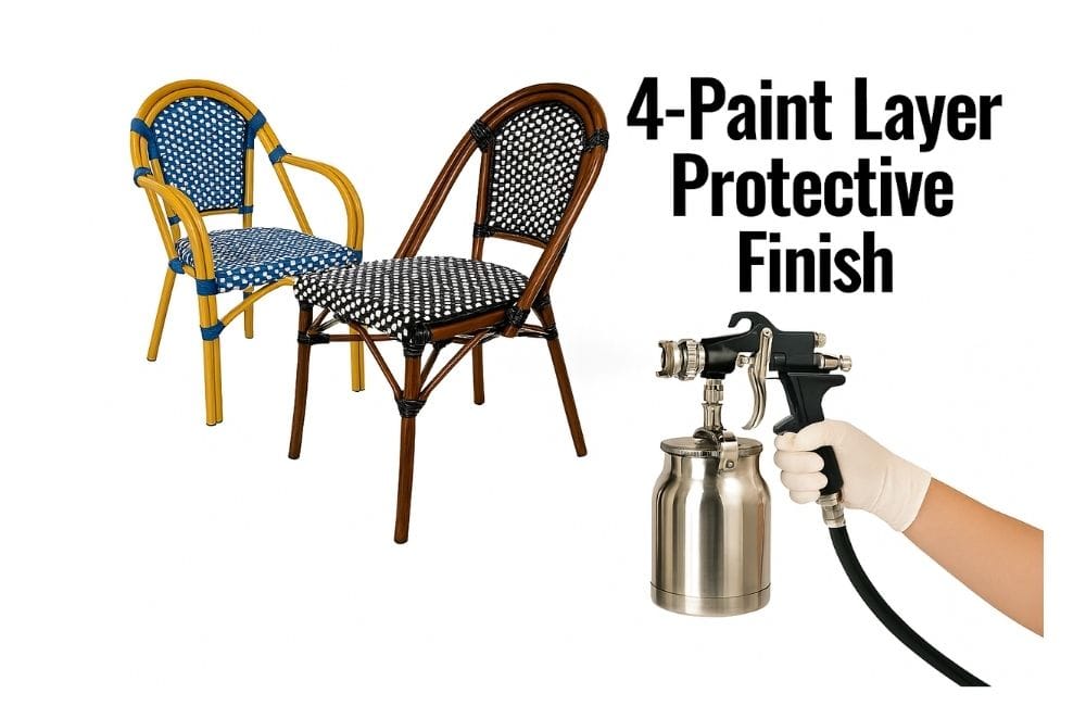 These beautiful French Bistro Chairs feature Marine-Grade, UV-Treated, hand-woven wicker in a variety of colors provides great comfort and style. The frame is made from rustproof aluminum and painted with a bamboo-finish and automotive clear coat. This makes it not only a great-looking chair, but a fantastic choice for a salty air-environments such as beachside cafes and yacht clubs.