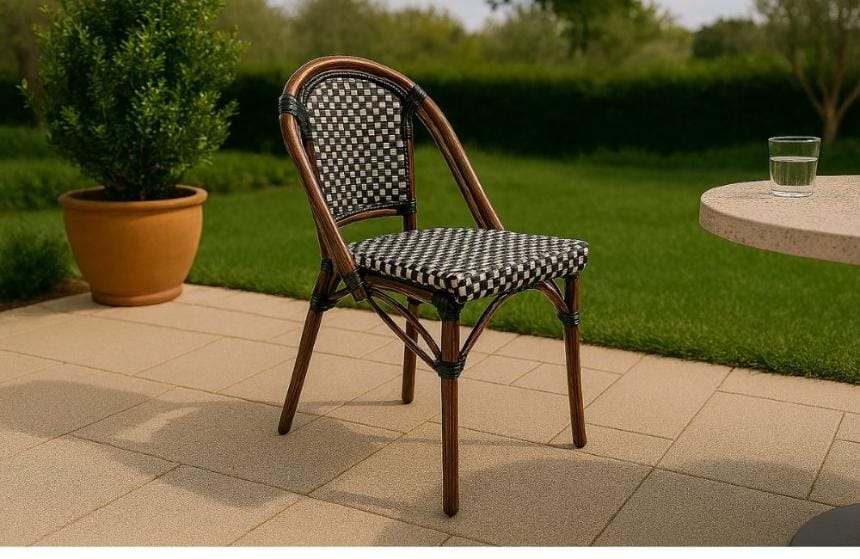 Our French Bistro Patio Dining Chairs features mold-resistant, hand-woven wicker, with brushstroke-painted aluminum frame that is fully rust-proof.