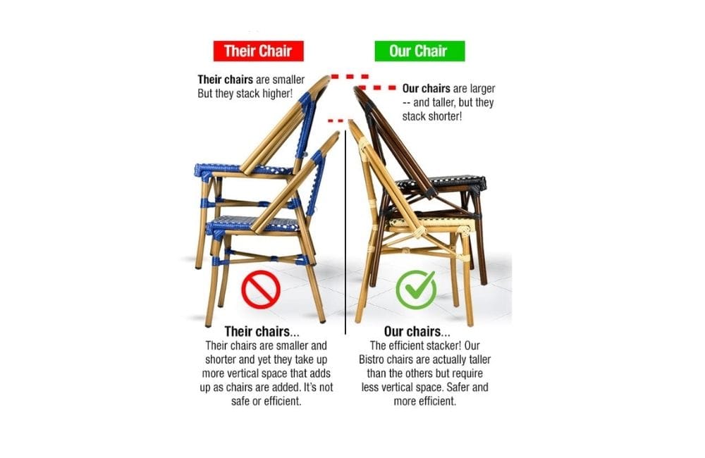 Our Toulouse Bistro chairs defy gravity and convention, standing taller than the competition yet stacking with deceptive efficiency. While others struggle with bulk, our chairs nestle snugly, minimizing vertical space without sacrificing stature. But it's not just about saving space; it's about ensuring security. Each stacked chair is engineered to lock into place, guaranteeing stability during transportation. With our chairs, safety and efficiency intertwine seamlessly, setting a new standard in stacking innovation.