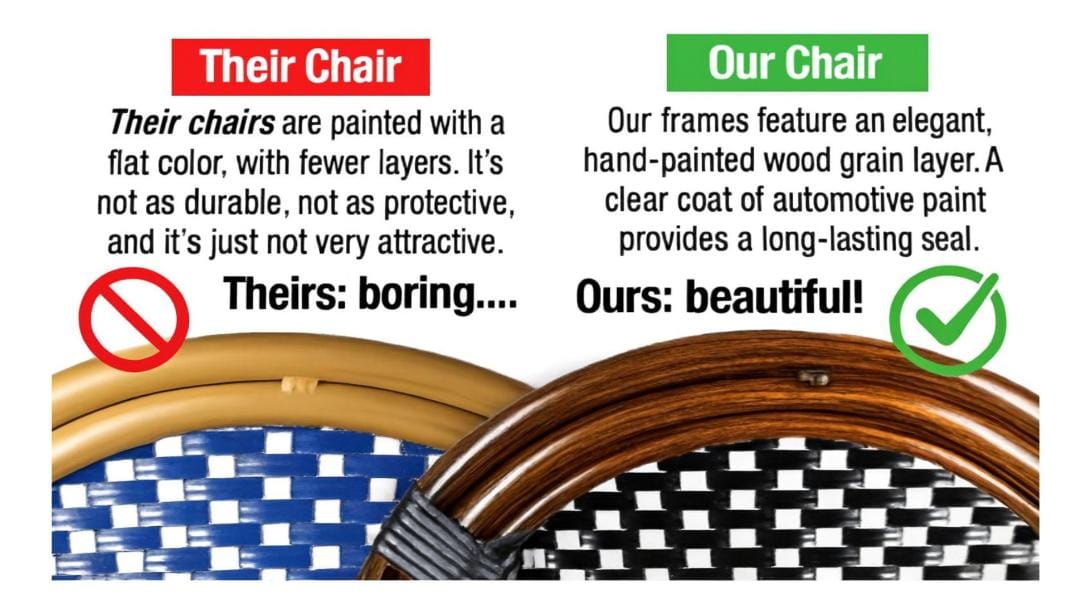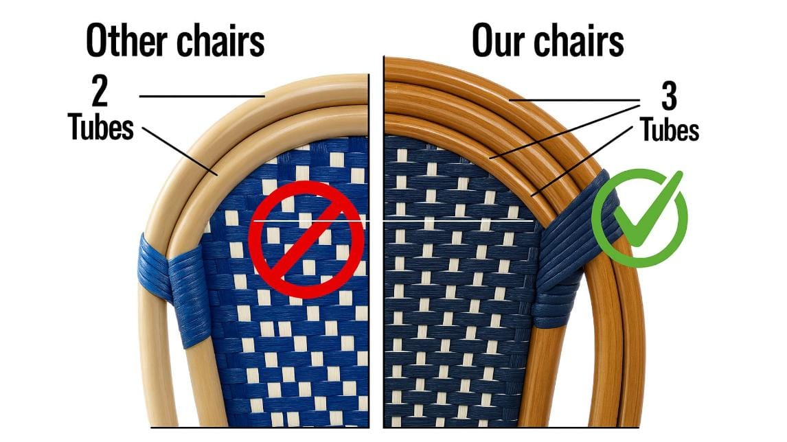 Other chairs use just 2 rows of tubing.... we use 3 rows of tubing to deliver extraordinary strength, beauty and comfort . Some competitors ship their chairs in pieces, requiring assembly. Their chairs are just not as strong or durable as ours. Single-piece construction makes an enormous difference in overall chair integrity and beauty
