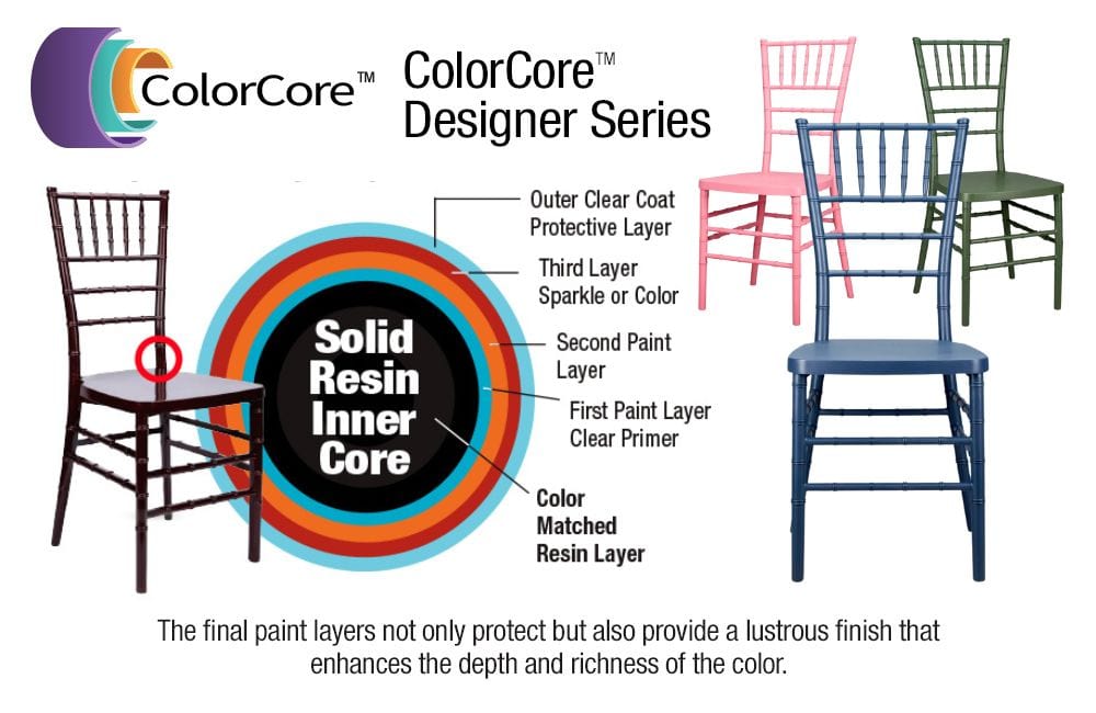 The Resin Steel Skeleton™ Chiavari Chair is crafted to withstand heavy use while maintaining its sophisticated charm. Its Steel Skeleton™ core ensures maximum strength, while the resin frame is coated with automotive-grade paint and a clear protective finish for a sleek and polished look.