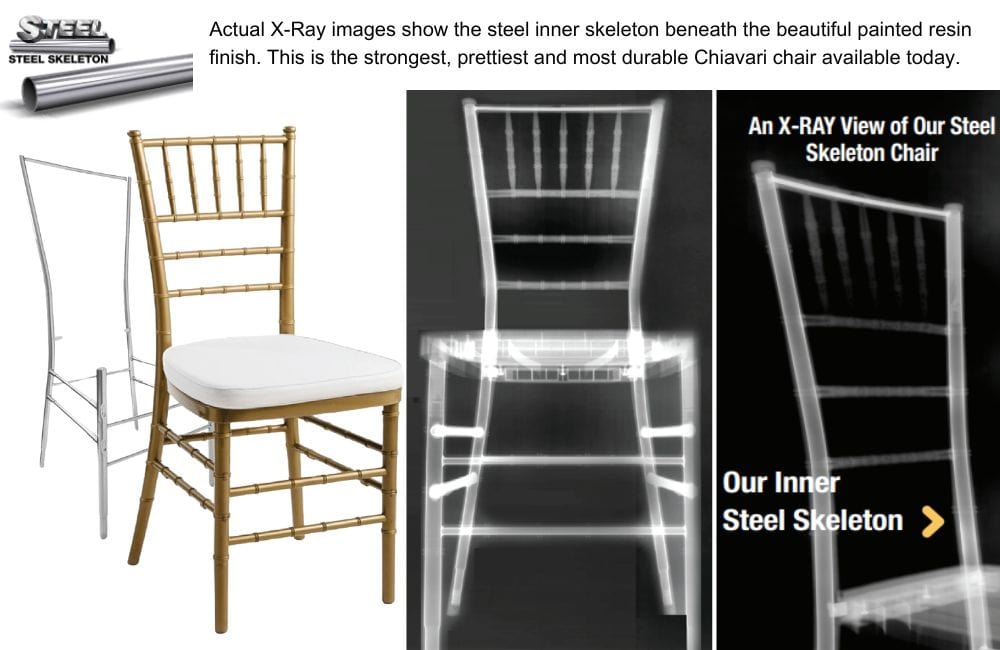 The inner Steel Skeleton™ is unique and what makes this resin Chiavari chair the strongest and most durable chair available today. A special manufacturing process wraps layers of beautiful and durable resin around the indestructible steel skeleton. Absolutely the Best Chiavari Chairs to buy when you Purchase Chiavari Chairs, whether you need Chiavari Chairs to Rent or to Buy Chiavari Chairs for your Own Use.