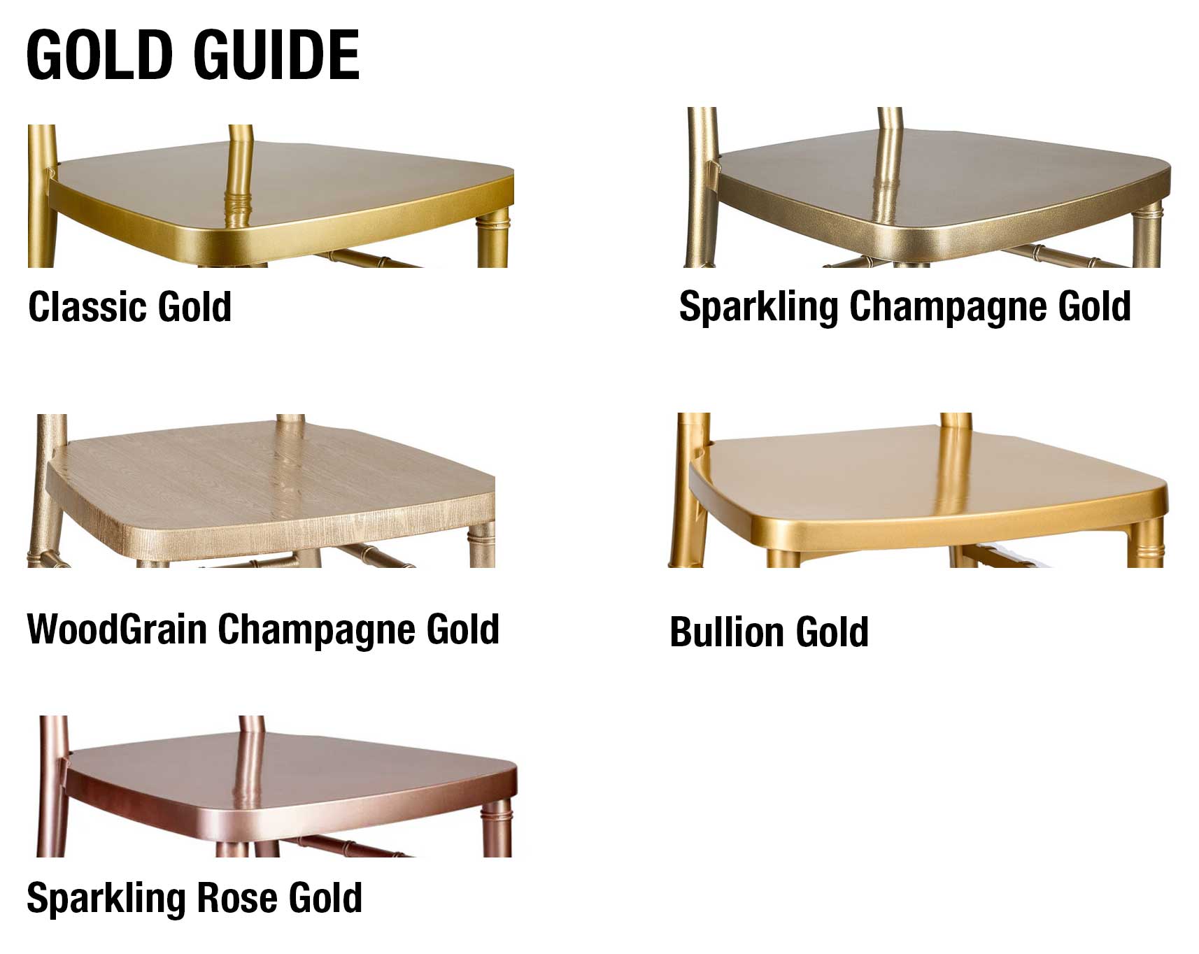 Chivari prides itself in providing the highest quality products with the incredible high quality finishes that stand out at the most prestigious events. That's why we offer you the choice of multiple Gold options.
