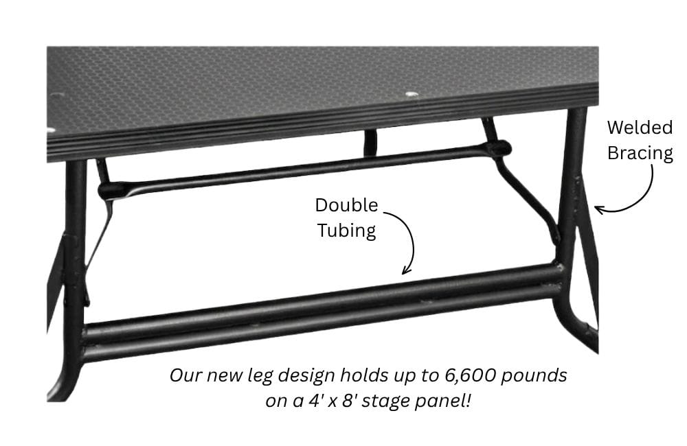 Every stage platform section is surrounded by our E-Channel Anodized Black Aluminum Edging. This feature provides an extremely strong, yet lightweight protective barrier around the entire edge of the platform. The anodized black finish isn't just for a sleek, professional look; it ensures your inventory stays protected from the inevitable bumps and scrapes of frequent transport and setup.
